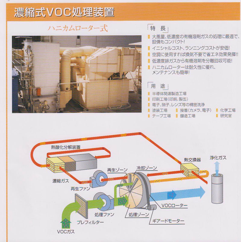 ♦最适合处理低浓度大风量有机废气,设备相对小型! ♦低初设费用!低运行成本! ♦浓缩后处理使燃烧设备实现最小型化! ♦热源多样化,根据风量可选择电热式及燃烧式! ♦装载高效率热交换器,实现更低运行成本 ♦可分离回收低浓度排气中的有机溶剂! ♦蜂巢式浓缩转轮,耐用持久,维护简单!