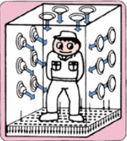 ﹡随着入口门的打开,空气从上面和左右侧面的管嘴同时喷出,将附着在作业者身上的灰尘异物等有效吹除